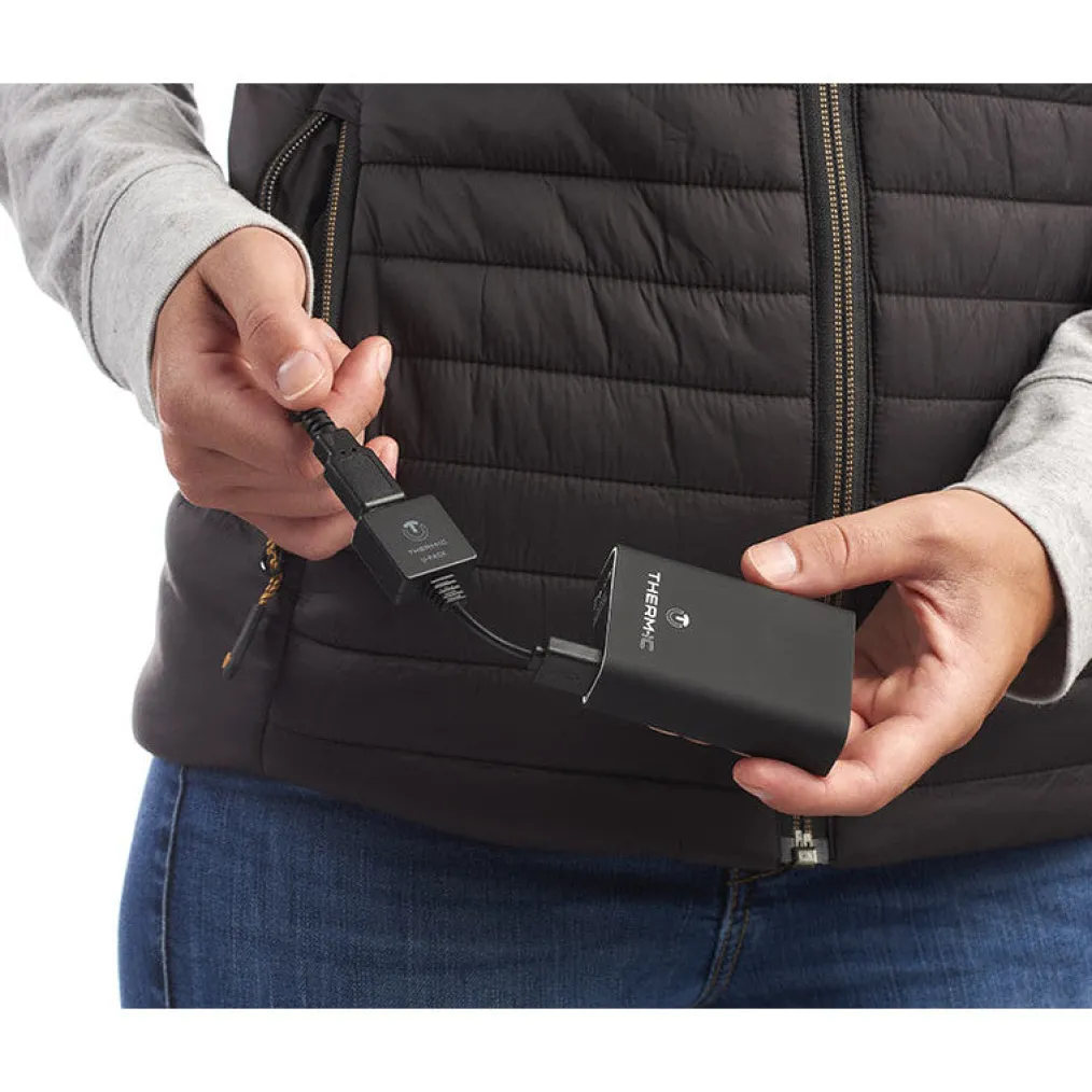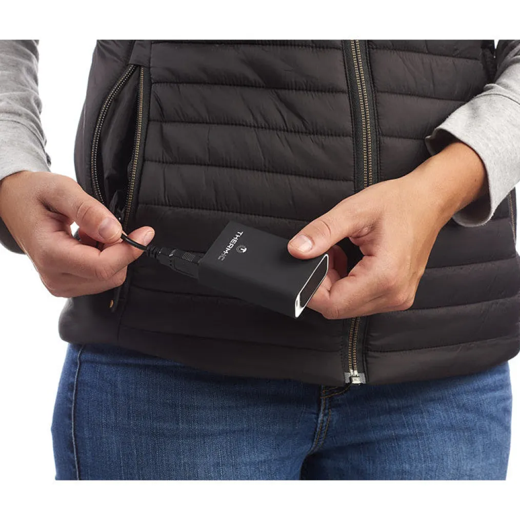 Connect the external charger (not included) to the USB cable on the interior of your pocket and slide it inside the jacket. The heated jacket is compatible with all external chargers. The Therm-ic universal external charger is recommended. • Unplug the powerbank from the vest to stop the heater.